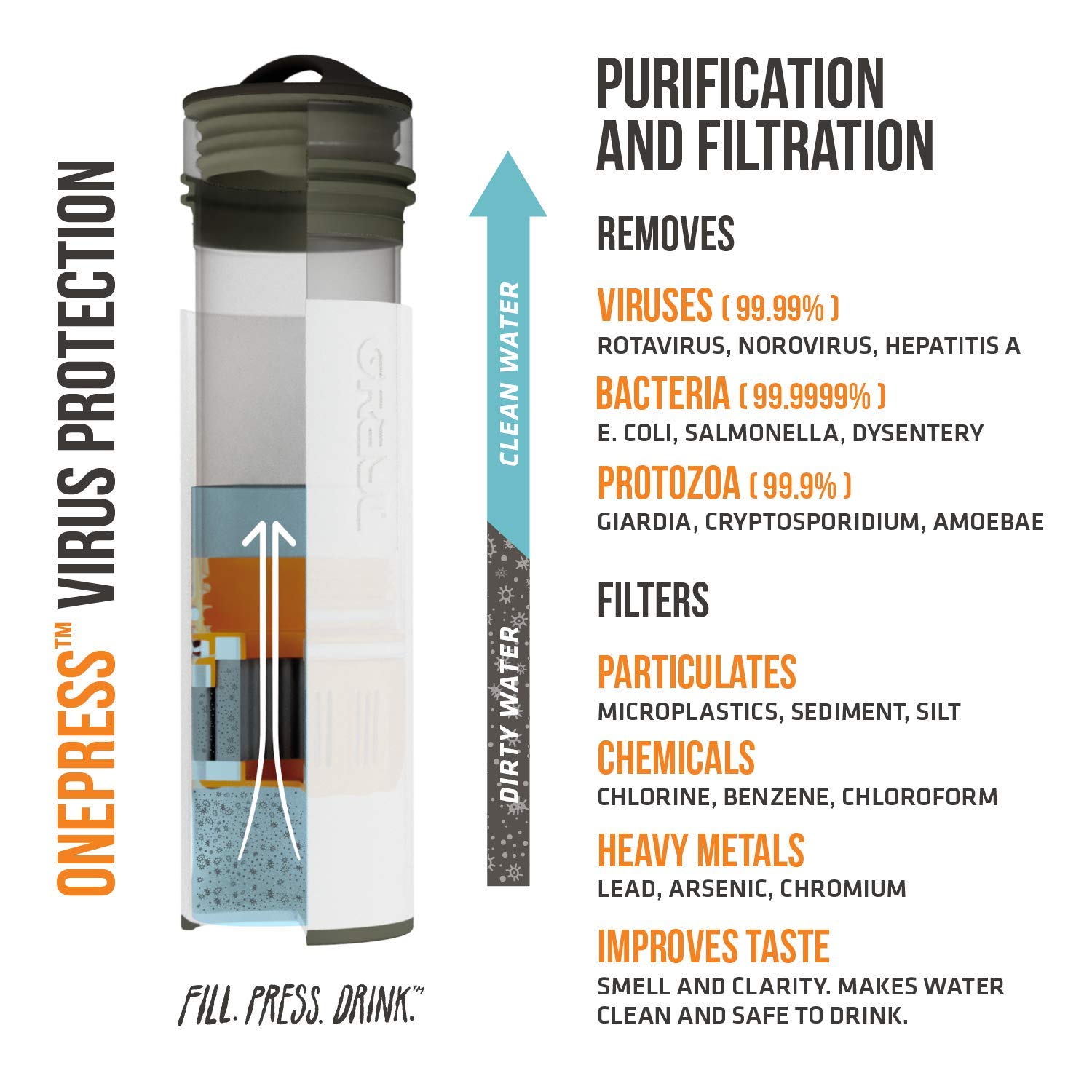 - Purify water, anywhere. Removes: waterborne pathogens (99.99% of viruses, 99.9999% of bacteria, 99.99% of protozoan cysts), including Rotavirus, Hepatitis A, Norovirus, Giardiasis, Cryptosporidium, E. Coli, Cholera, Salmonella, Dysentery and more