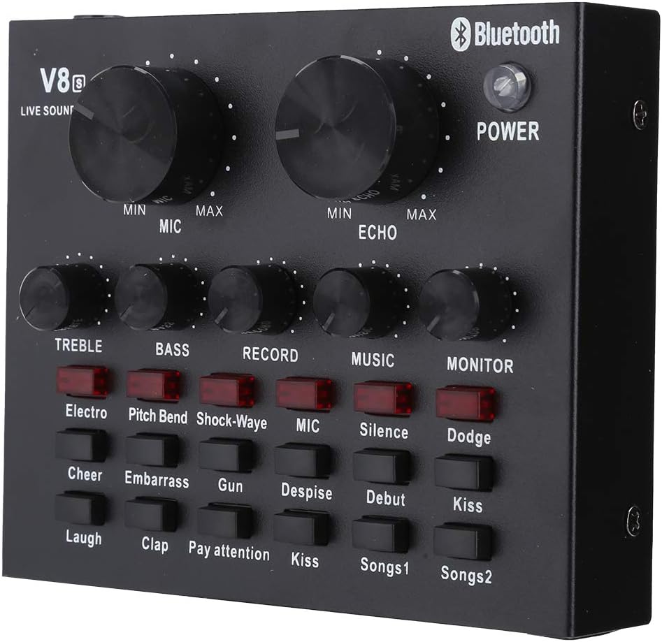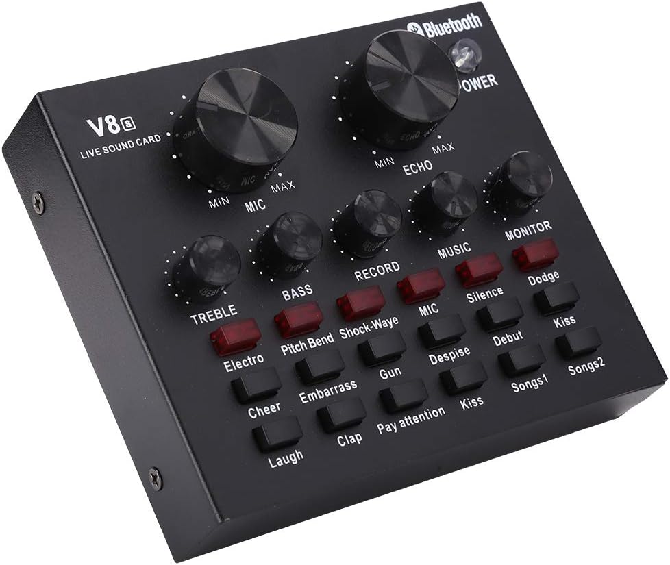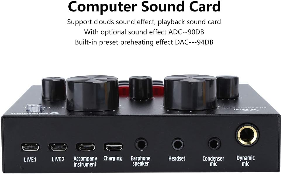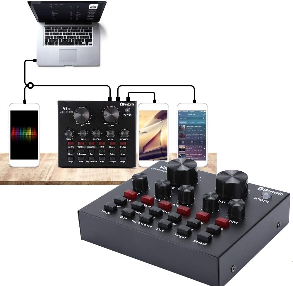 • 【GOOD PERFORMANCE】The V8 sound card adopts intelligent noise-reduction chip and high performance computing, this live sound card performs clearer and more stable sound quality. It is widely used for singing, shouting, live streaming, funny chatting, music Recording.